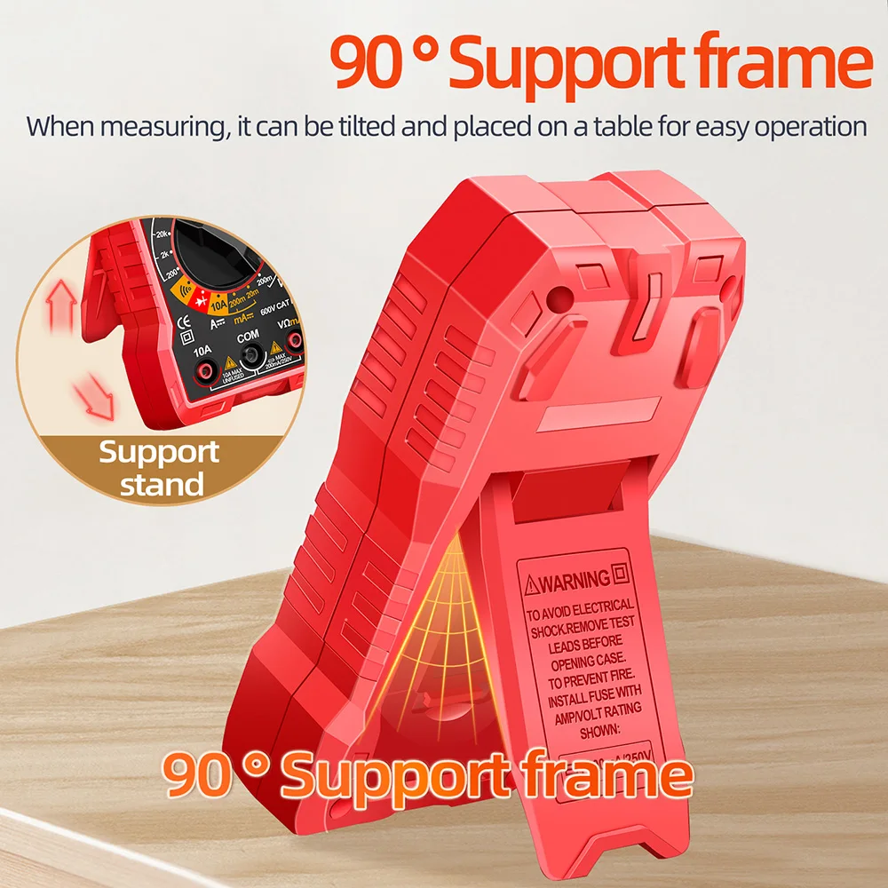 1.90 ° bracket support placement contraction: There is an extended support bracket on the back, which effectively supports the multimeter. When measuring, it can be tilted on the table for easy standing operation